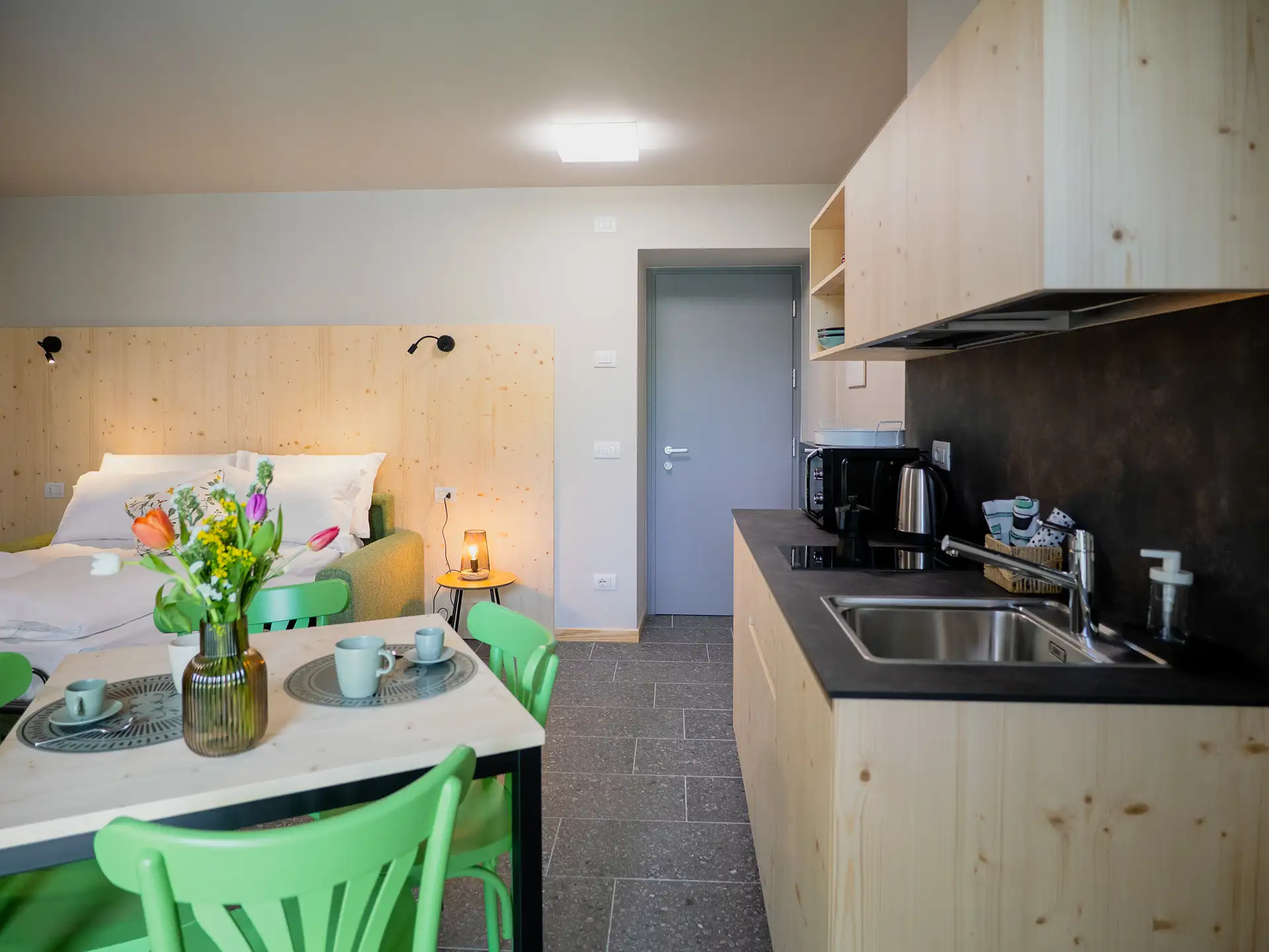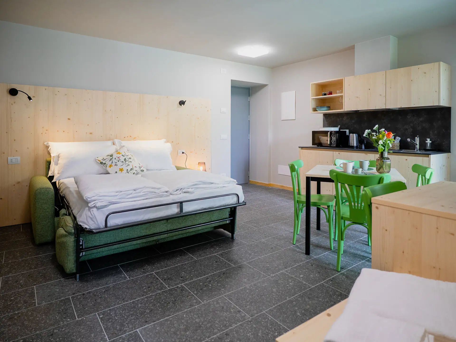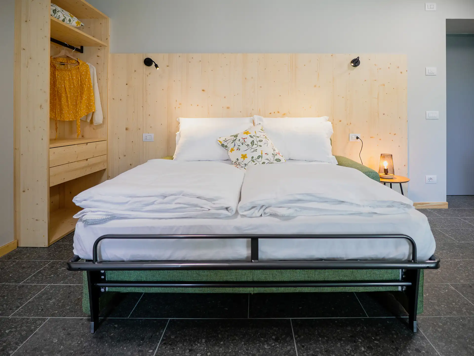 The masùn were the stables of the village, symbols of the simple and rural life that was led here, a refuge for animals: cows, sheep and horses The studio apartment on the ground floor recalls their warmth and familiarity. Thanks to its welcoming atmosphere, it is the perfect space for couples looking for a quiet refuge after a day of exploring the valley.
